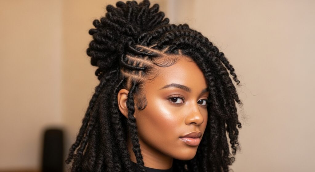 A hybrid protective style. Start at your hairline and do a two-strand flat twist for an inch or two along your scalp. Then, instead of continuing to twist the ends, take the two strands and finger coil them together as one. This gives you the neat, scalped look of a flat twist at the root that transitions into a defined, hanging coil. Perfect for edges and front styles.