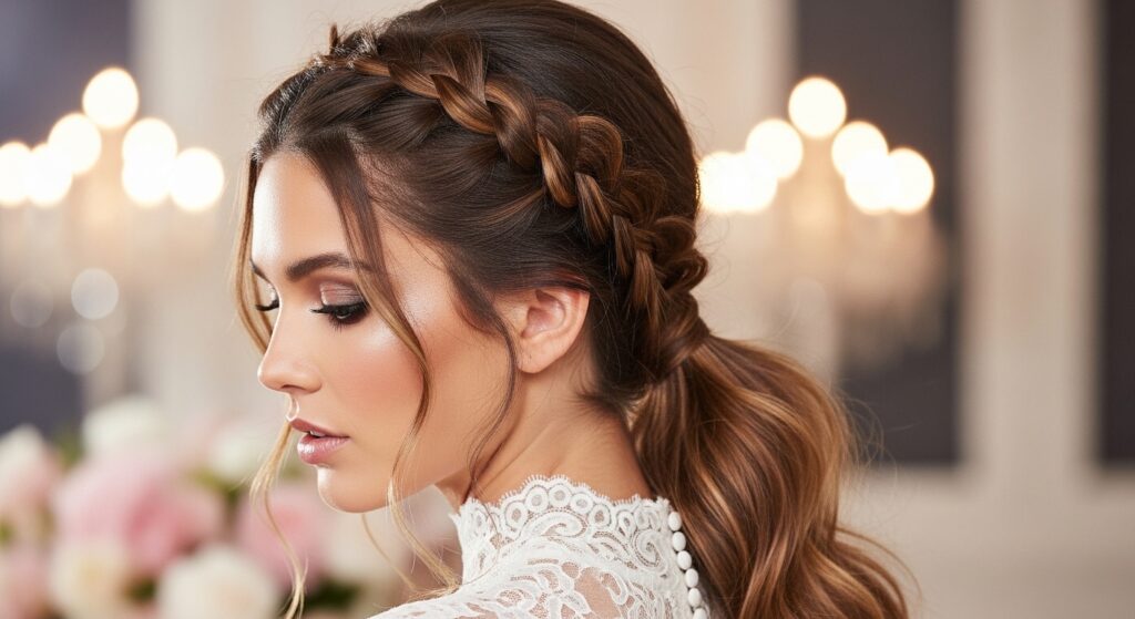 For a truly regal look, craft a French braid that acts as a crown. Begin braiding at one side of your forehead, continuing around the hairline until you circle back to the starting point. Secure the end, then gather the hair from within the crown and the remaining loose hair below into a low ponytail at the nape of your neck. It’s a half-up, half-down masterpiece that’s ideal for weddings or formal events.