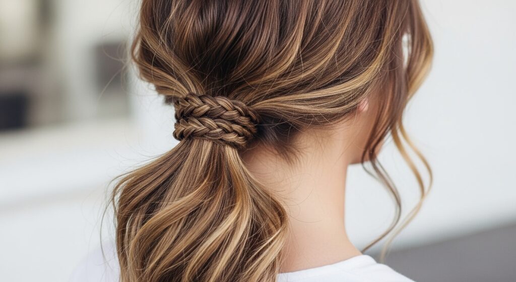 This idea focuses on dressing up the ponytail holder. Create a simple, low, and tousled ponytail. Then, take a small section of hair from underneath the ponytail, braid it into a thin three-strand braid, and wrap it around the base of the ponytail to conceal the elastic. Secure it with a bobby pin. It’s a minimalist yet incredibly chic way to add a braided element.