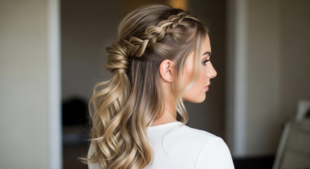 This is a fantastic way to keep hair out of your face while leaving length down. Create a half-up section by French braiding a U-shaped section from temple to temple around the back of your crown. Secure this braid into a small, half-up ponytail. The rest of your hair flows freely below, offering a polished yet effortless everyday style.