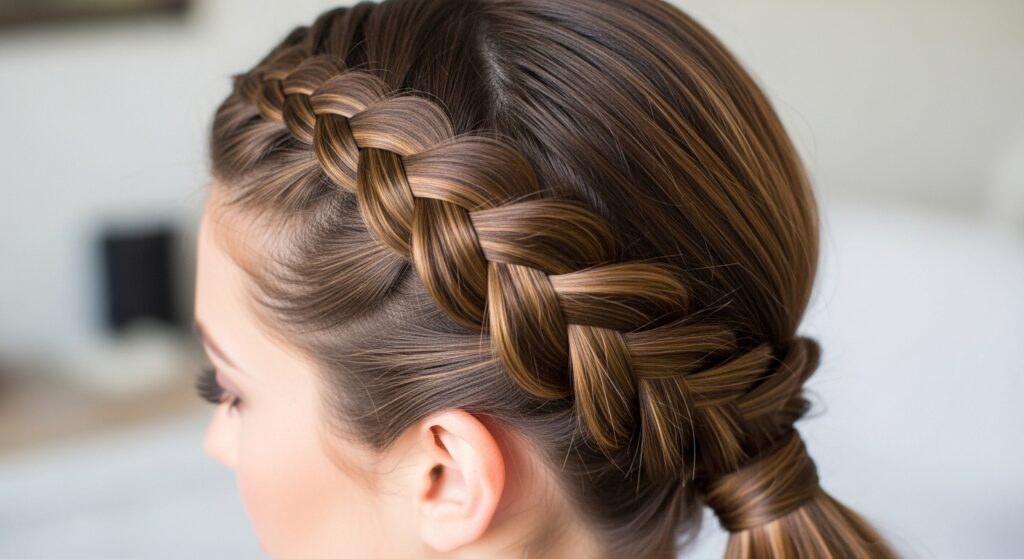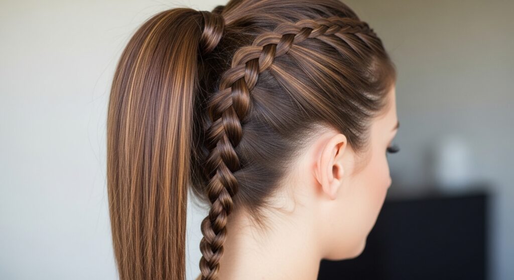 This is the perfect entry point for beginners. Start a French braid at one temple, gradually incorporating hair as you work diagonally across the back of your head to the opposite side. Once you reach the nape, gather all remaining hair and secure it into a low or mid-height ponytail. The result is a romantic, asymmetrical detail that softens the face and adds instant sophistication to a simple ponytail.