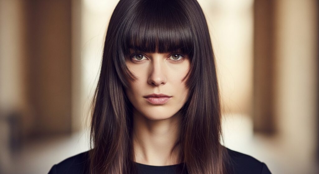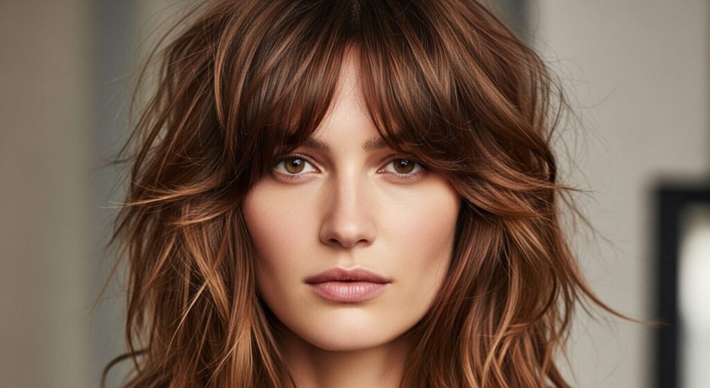 If you’re not ready for a full fringe, side-swept bangs are a perfect compromise. They cover a portion of the forehead, shortening the face, while the diagonal line draws the eye across. Combine them with long, face-framing layers to complete the effect.