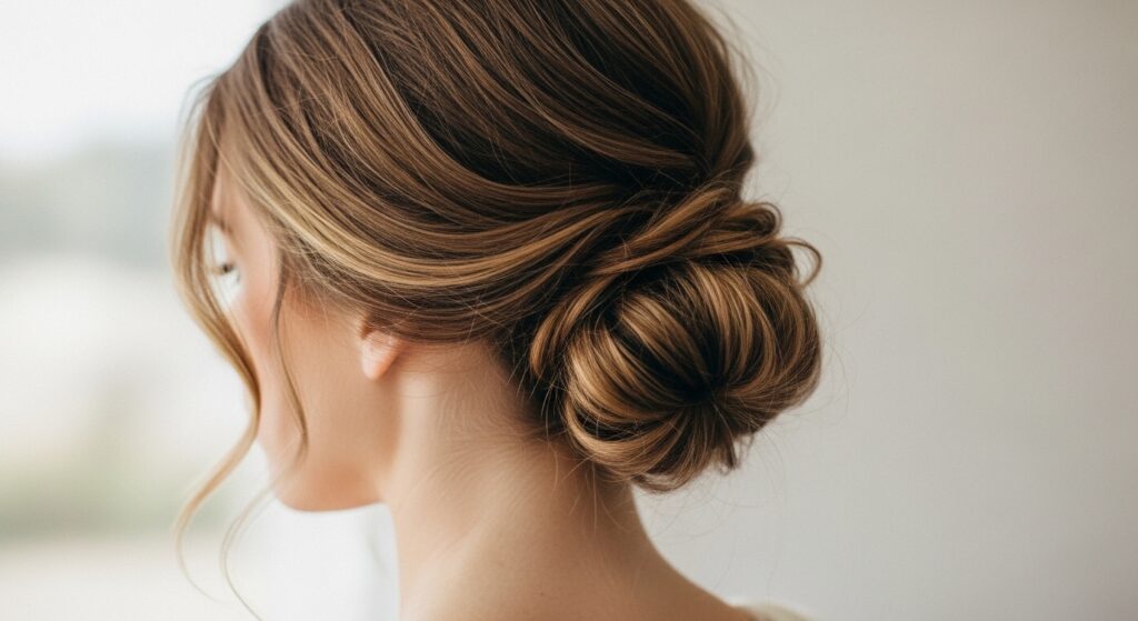Similar to the braid, a bun positioned at the nape of your neck keeps the vertical line in check. Make it messy and loose, allowing tendrils and face-framing pieces to escape. This softens the look and creates gentle width around your face.