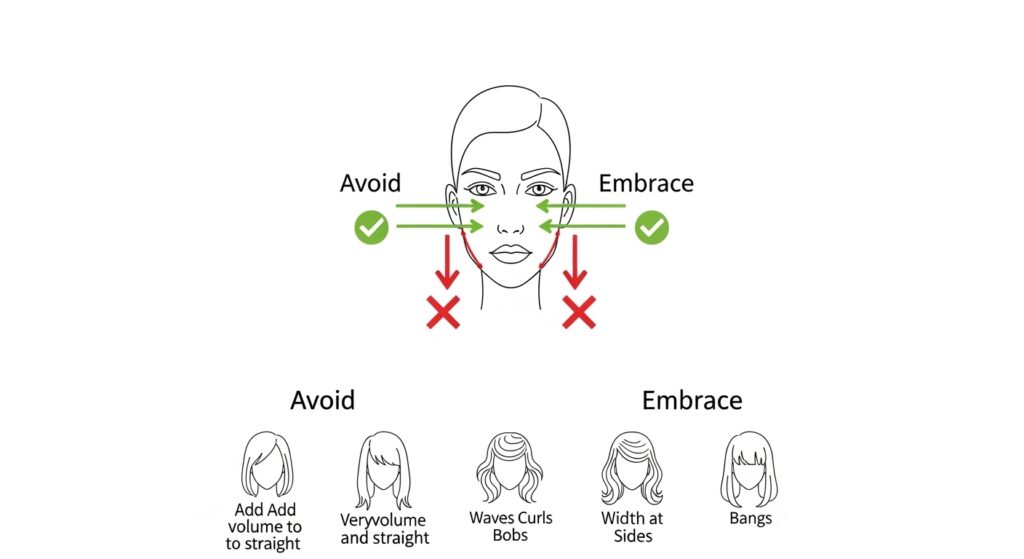 Embrace: Width-building elements like waves, curls, volume at the sides, and fringe (bangs). Shorter to medium lengths that hit at the collarbone or above are often most effective. Side parts are your best friend, as they break up the vertical symmetry of the face.