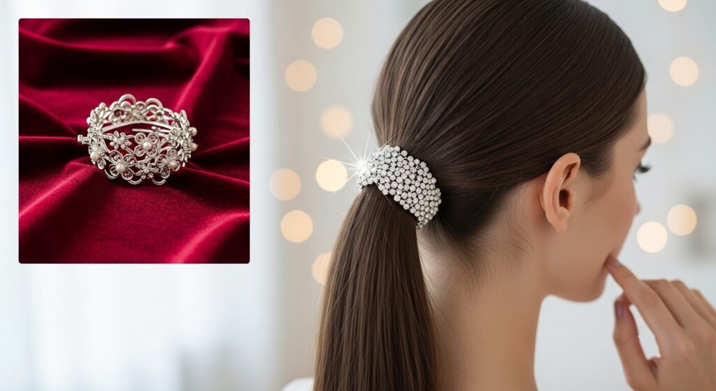 The Crystalline Cuff: This piece looks more like a piece of fine jewelry than a hair tie. Often a rigid or semi-rigid cuff densely covered in shimmering crystals, it’s meant to be showcased in a sleek, low ponytail or chignon for black-tie events.