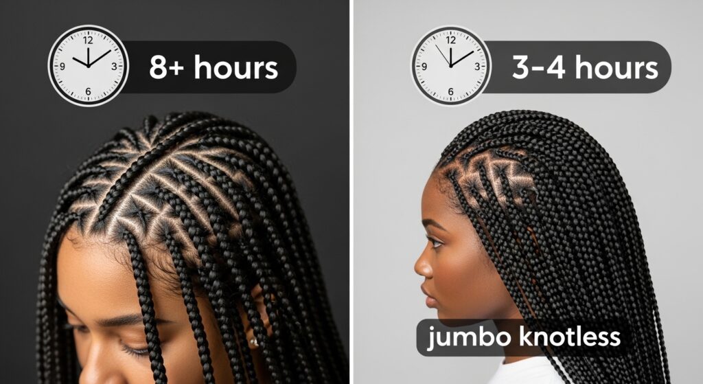 For the ultimate in seamless beauty and scalp comfort, knotless jumbo braids are the move. Adding loose, bouncy curls or waves at the ends softens the look and adds incredible movement. This style cuts down time by eliminating the bulky knot at the base, making the braiding process smoother and faster from the start.