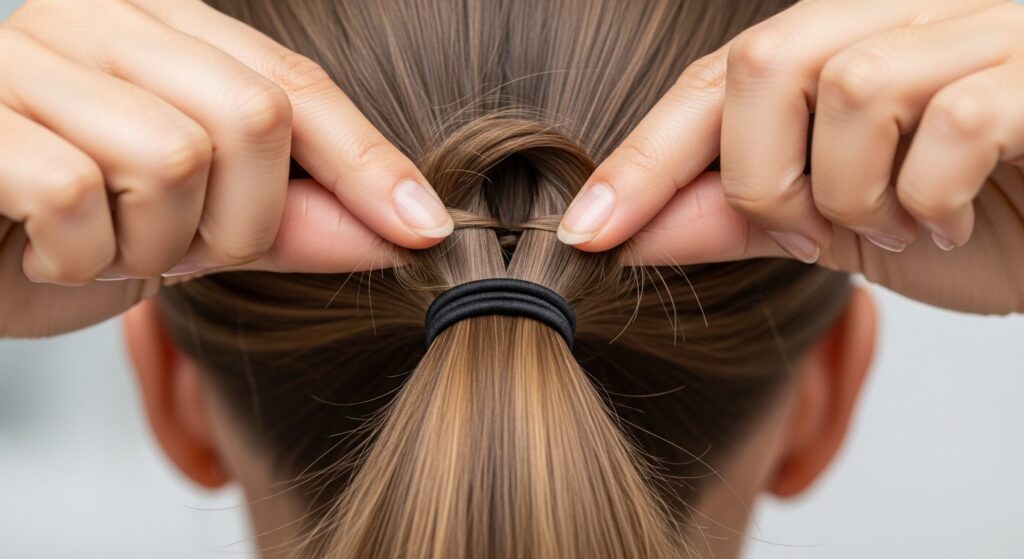 For a subtle twist, create the hole below the ponytail base instead of above. Secure a low ponytail, make a gap between the tie and your head, and pull the tail down and through. This creates a beautiful, cascading effect that adds volume at the nape of the neck.
