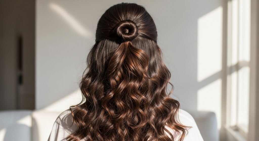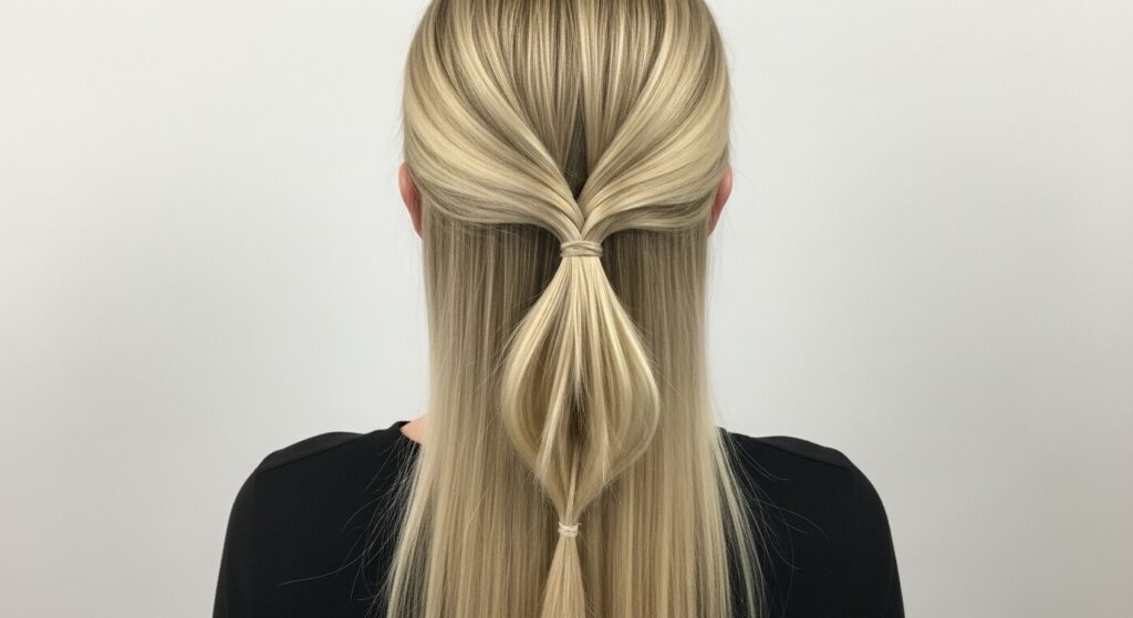 Take your half-up style to the next level. Gather the top section of your hair as if for a half-up ponytail, but instead of a standard tie, create a small pulled-through loop. This adds immediate height and volume at the crown while letting the rest of your hair flow freely. It’s a perfect way to add interest without committing to a full ponytail.