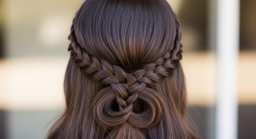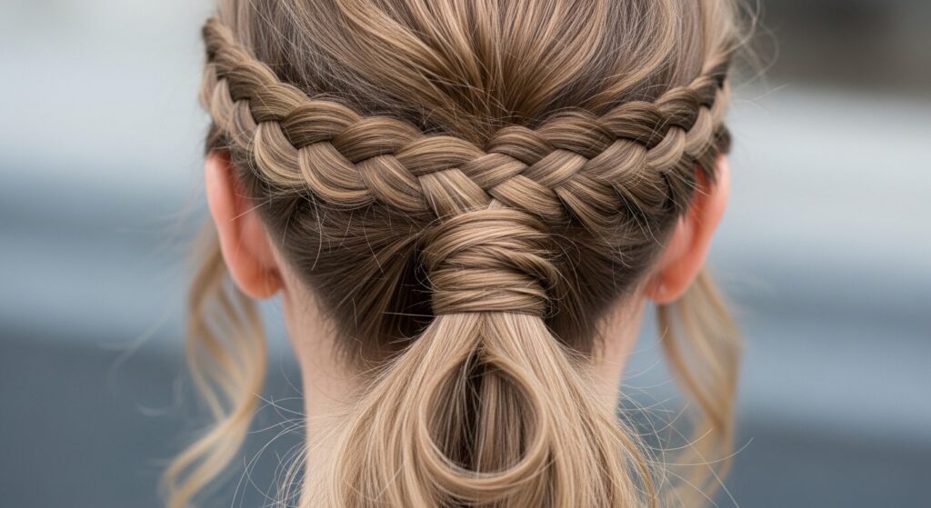 Part your hair down the middle. Create two low ponytails, one on each side at the nape of your neck. Perform the pulled-through technique on the left ponytail, pulling it to the right, and on the right ponytail, pulling it to the left, so they cross. Secure them together loosely. This creates a beautiful, intricate look from behind.