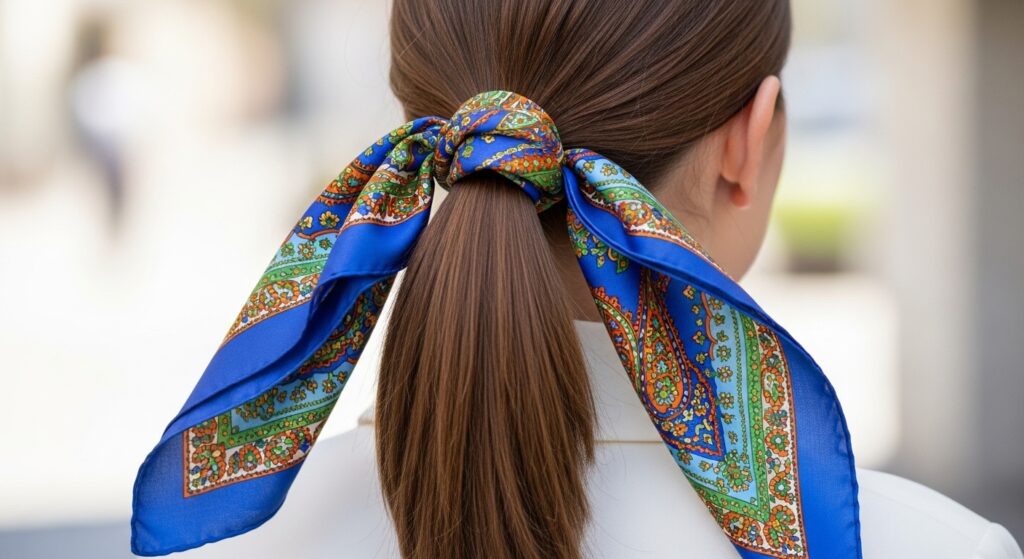 Use a silk scarf to elevate the basic style. Tie your hair into a low ponytail with the scarf (use it as your hair tie). Then, pull the ponytail through the loop above, allowing the scarf’s ends and pattern to become part of the hairstyle. It’s a beautiful way to add color, pattern, and a luxe touch.