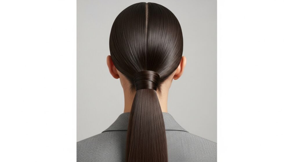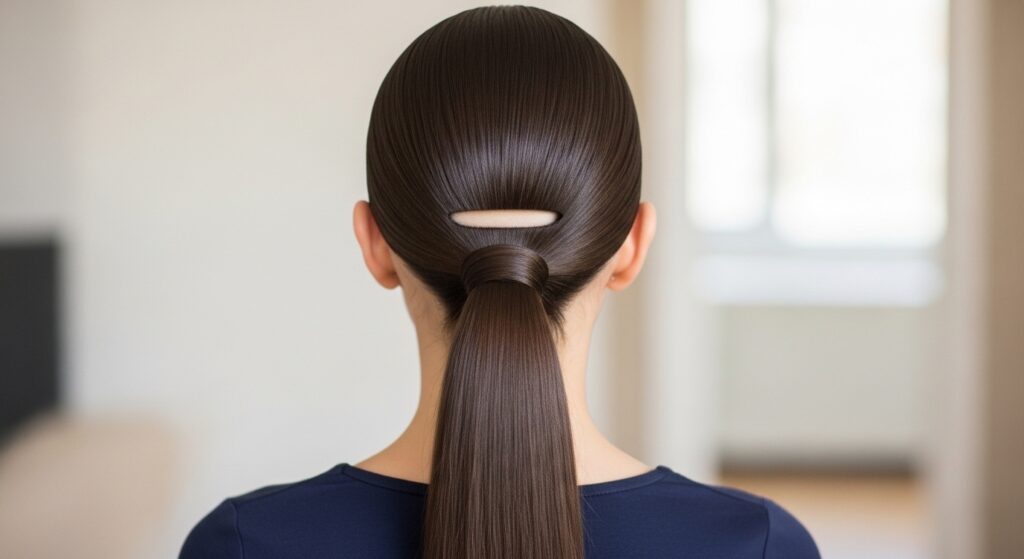 For that sleek yet full look, start by teasing the hair at your crown. Gather a very high, tight ponytail (smooth the top surface, but keep the base secure). Do the classic pull-through technique, but then use the tail to wrap around the hair tie base, pinning it underneath. This gives the illusion of a massive, full ponytail base with a sleek finish.