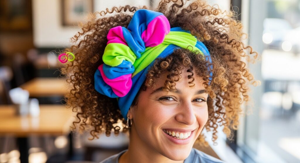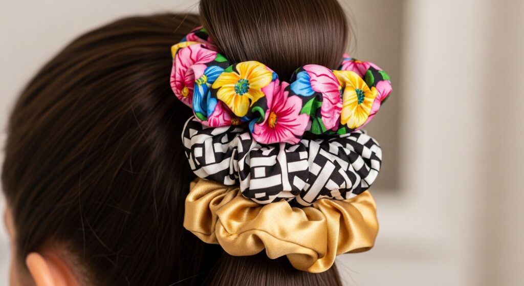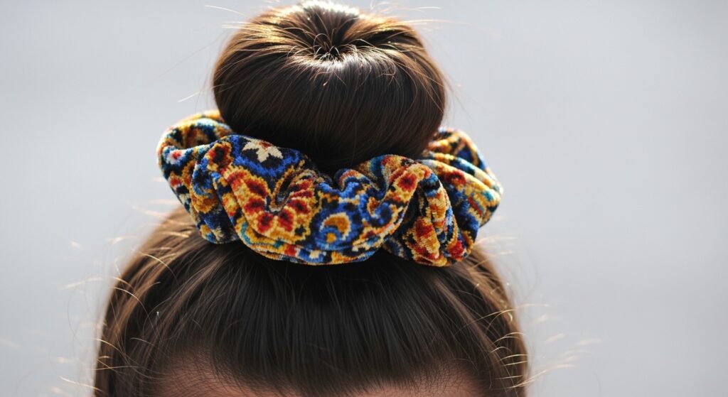 Let’s start with an easy upgrade. Instead of using one scrunchie, use two or three! Create your standard ponytail with your first scrunchie. Then, take a second (and third) scrunchie and wrap it around the base, stacking them for a bold, colorful, or textural effect. This adds instant dimension and turns a simple pony into a deliberate style statement. Mix patterns and fabrics for a playful look.