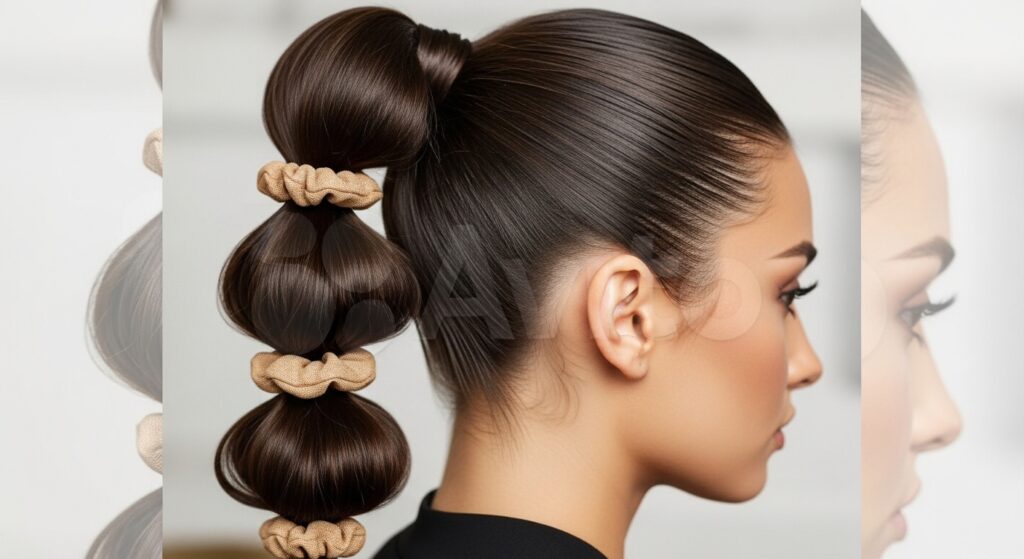 This futuristic-looking style is surprisingly simple. Create a high ponytail with a scrunchie. Then, place additional scrunchies down the length of the tail, spacing them 2-3 inches apart. After each scrunchie is secured, gently tug on the section of hair between scrunchies to “puff” it out, creating the “bubble” effect. The softness of scrunchies makes this style comfortable and visually interesting.