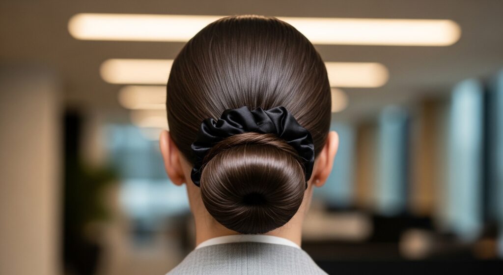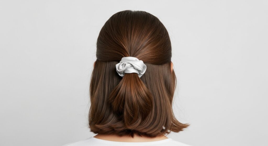 This illusion is genius for short hair or adding a pop at the nape. Create a low, loose ponytail with a scrunchie. On the last loop, don’t pull your hair all the way through—create a loop, but then tuck the ends of your hair up and into the base of the loop, hiding them. It looks like a chic, folded-under bob or a neat twist, with the scrunchie serving as a beautiful accent at the back.