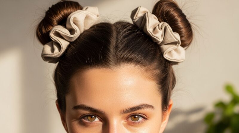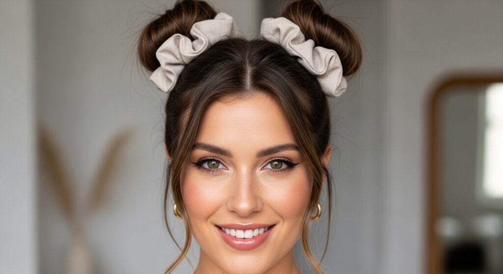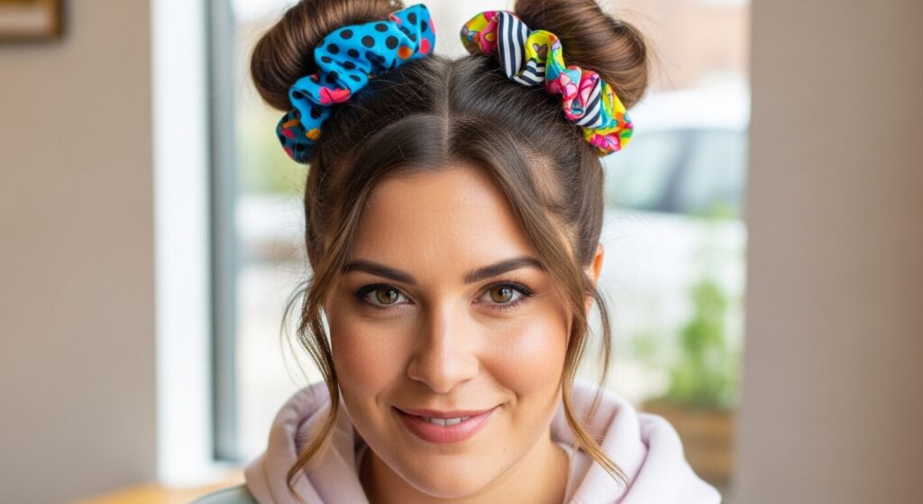 Space buns get a softer, less severe update with scrunchies. Part your hair down the middle. Make two high ponytails, one on each side, using scrunchies. Wrap each ponytail around its base to form a bun, and secure the ends with the same scrunchie or a second one. The result is a fun, relaxed version of the space bun that’s perfect for festivals or a playful day out.