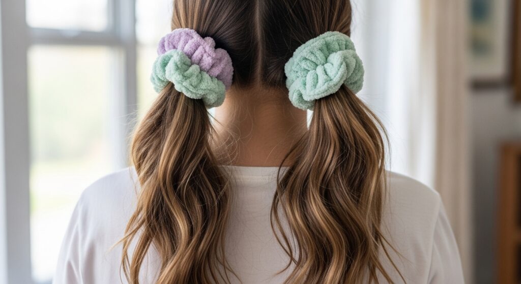 Give simple pigtails a fresh twist. Create two low or high pigtails, securing the ends with scrunchies instead of regular elastics. Let the ends of your hair flow out from the scrunchie for a carefree look, or wrap them into mini buns. Using contrasting or extra-large scrunchies makes this style feel intentional and chic, not childish.