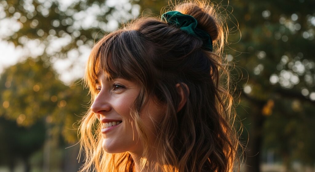 This is the perfect blend of casual and chic. Gather the top half of your hair as if you’re making a half-up ponytail. Instead of securing it with a clear elastic, use a scrunchie. Twist the length of the half-up section and wrap it around the base, securing the ends with the same scrunchie to form a small, loose bun. Let the bottom hair flow free. It’s romantic, relaxed, and keeps hair out of your face.