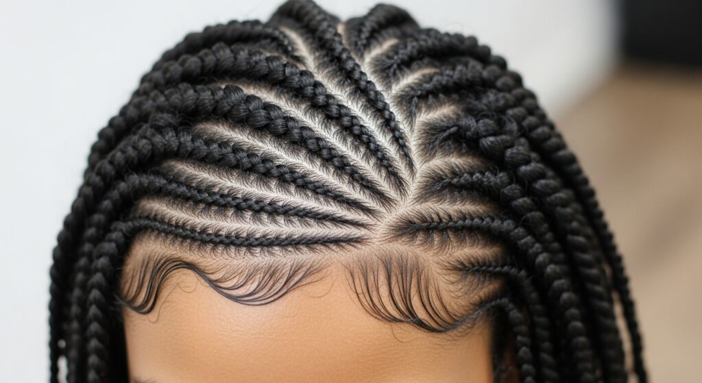 4. Flat Twists into Loose Senegalese Twists: Start the first few inches near your hairline in flat twists (cornrows) that then transition into loose Senegalese twists for the remainder of the length. This creates a sleek, sculpted look at the crown that is both elegant and protective of your edges.