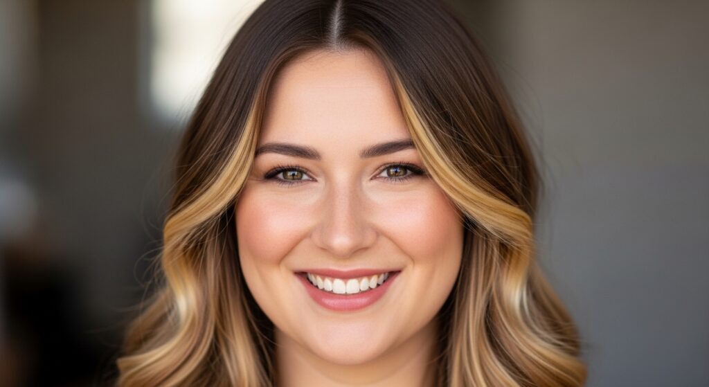 3. Deep-Parted Balayage: A strong side part with balayage concentrated on the larger section pulls attention diagonally, breaking the round symmetry.