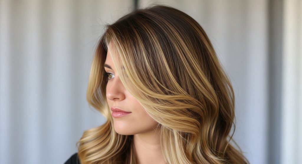 4. Vertical Ribbons: Strategically placed, vertical lightened “ribbons” from root to mid-lengths, avoiding the sides near the cheeks.