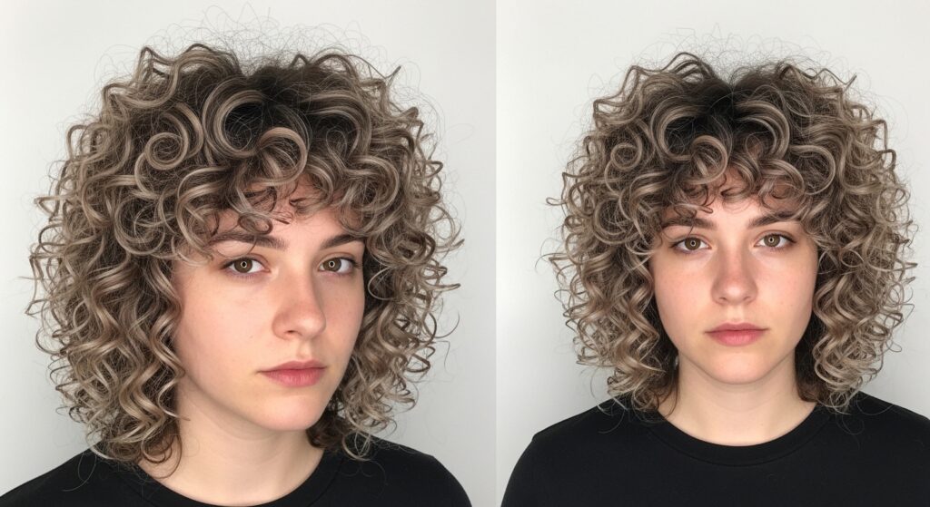 6. Curl-Enhancing Balayage: For wavy or curly hair, place highlights to maximize curl definition. The resulting soft, rounded curl patterns naturally offset angular lines.
