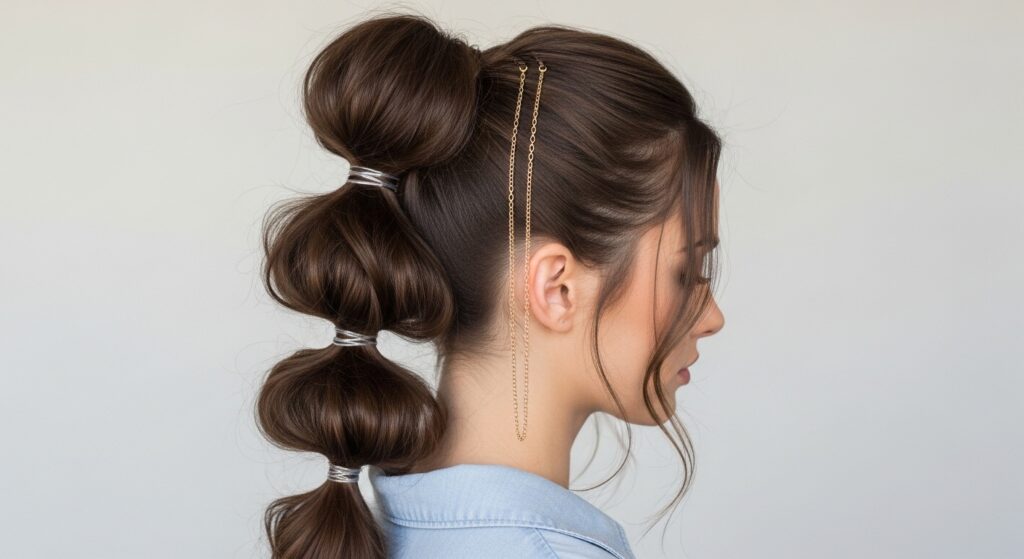 12. Chain & Jewelry Accents: Drape a delicate hair chain across the bubbles or use connector chains designed for hair to link the elastics. This edgy, metallic detail instantly elevates the style to high-fashion.