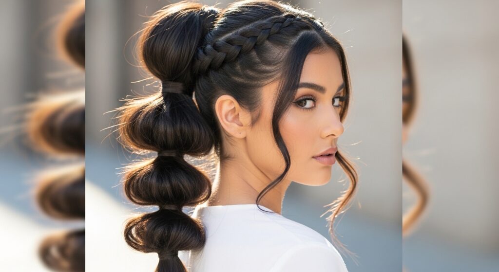 8. Bubble Ponytail with Face-Framing Braids: Incorporate two small braids from your temples, weaving them back into the base of the ponytail. This softens the look and adds a delightful boho touch to the playful bubbles.