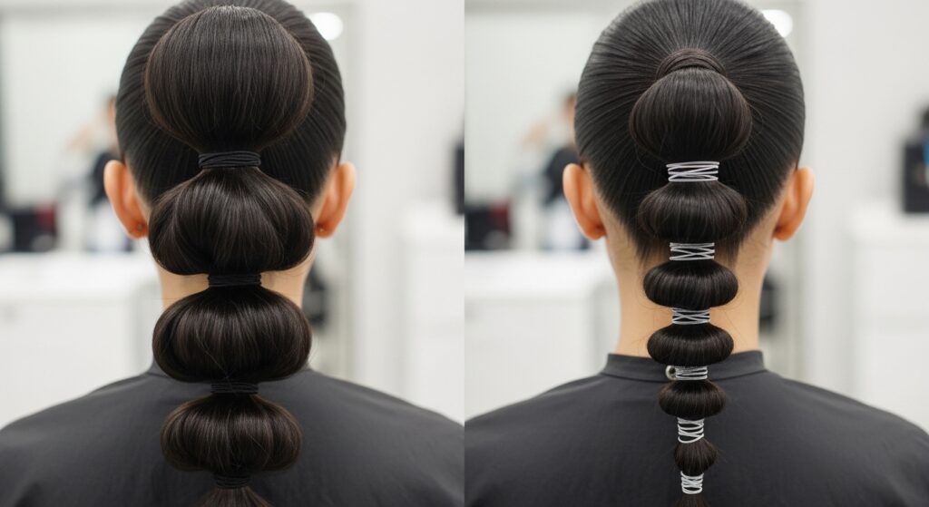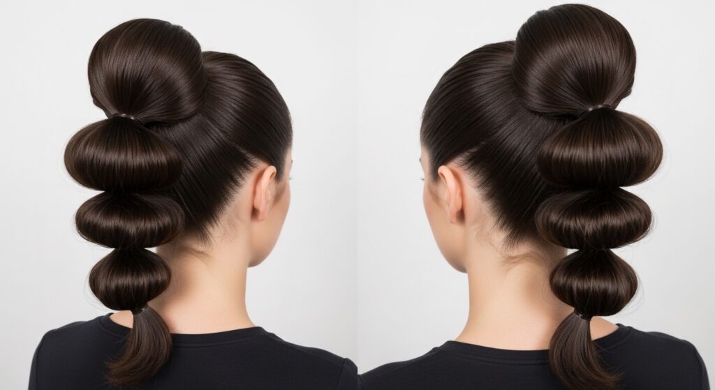 1. The Micro Bubble Ponytail: For a truly modern, detailed look, use very small sections between ties. This creates more bubbles and a intricate, almost architectural effect. It works beautifully on straight, sleek hair, highlighting the precision of each “bubble.”