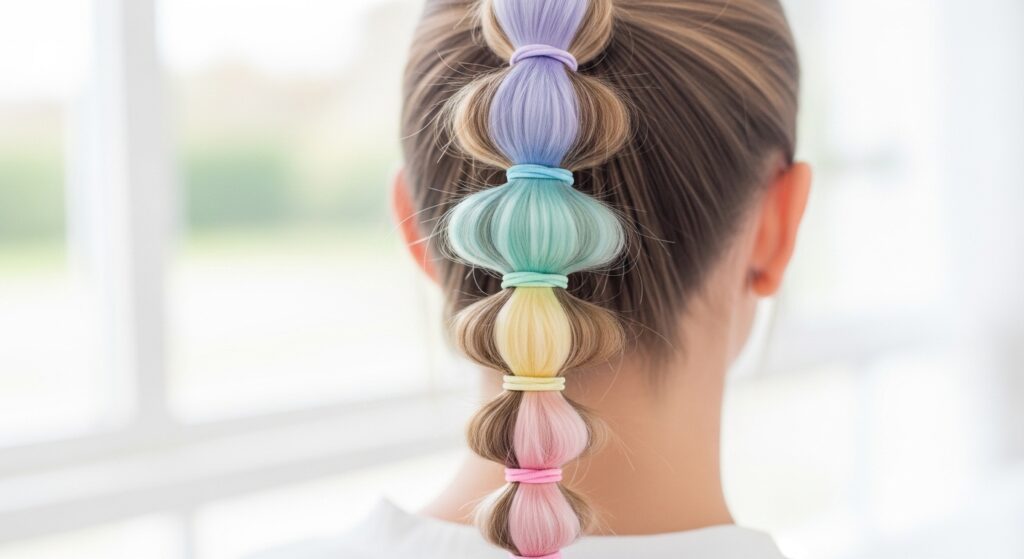 10. Colorful Tie Bubble Ponytail: Use a rainbow of small, colorful hair ties instead of clear or neutral ones. Let them peek out between each voluminous bubble for a fun, youthful, and festival-ready look.