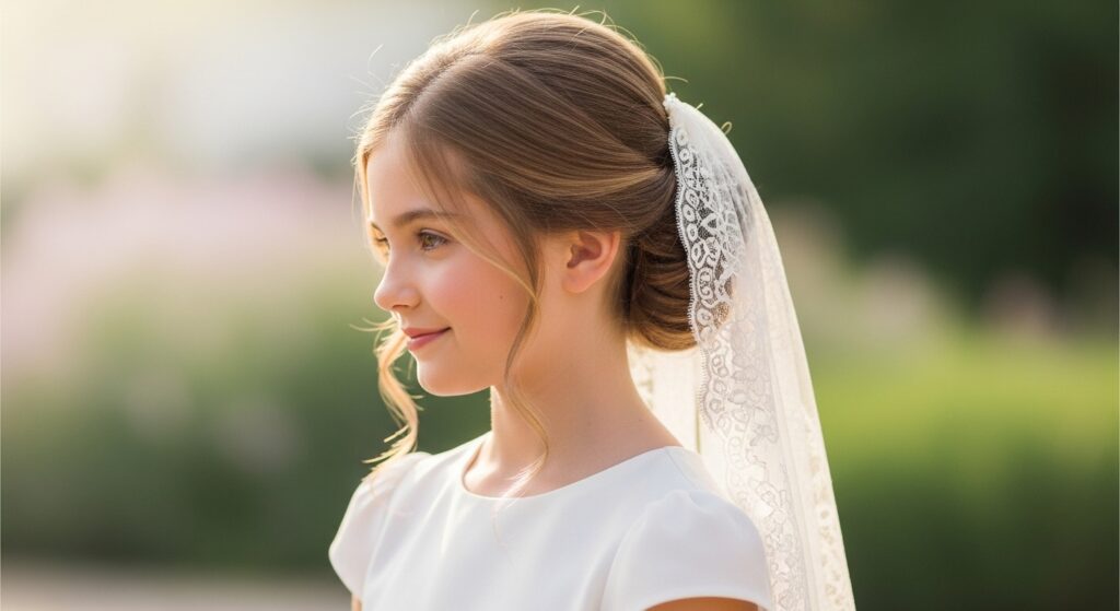 Keep it Age-Appropriate: The goal is to enhance her natural beauty, not to make her look like a miniature adult. Avoid overly teased or severe styles. Softness and a touch of whimsy are perfectly fitting for this celebration of childhood faith.