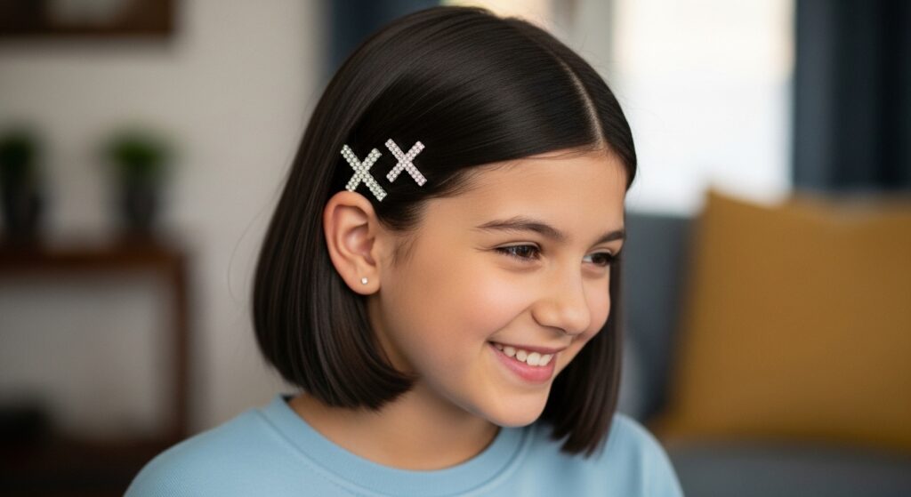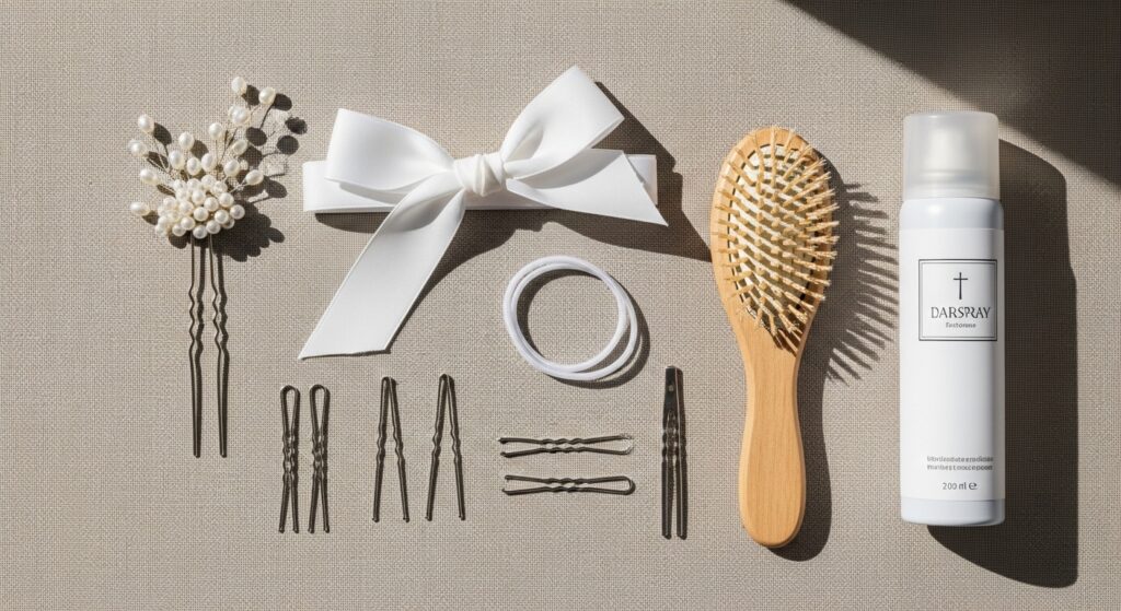 Pulled-Back with Barrettes: For shorter hair or bobs, simply tuck the hair behind the ears and secure each side with a beautiful, meaningful barrette—perhaps one with a cross, dove, or floral design. It’s clean, sweet, and age-appropriate.