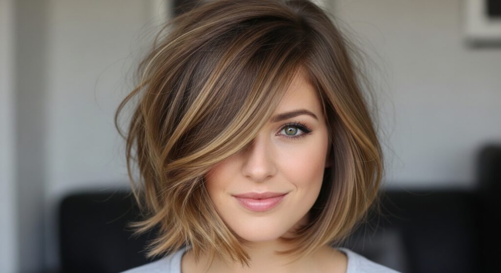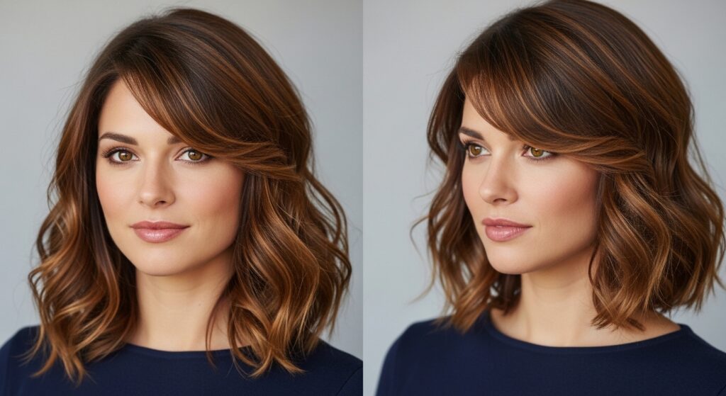 This is the quickest fix in the book. Switching from a center part to a deep side part instantly creates asymmetry and covers a portion of the forehead with the hair from the heavier side. It also adds volume at the roots, lifting the hair away from the face in a flattering way.