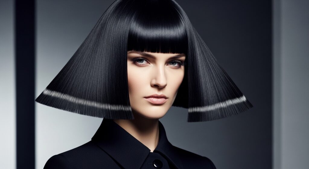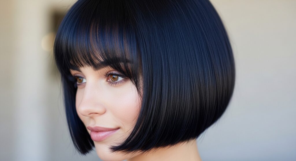 Combine two powerful ideas: the structure of a blunt bob that ends at the jawline draws a strong horizontal line, while a wispy fringe adds the necessary forehead coverage. This look is polished, contemporary, and incredibly balanced.