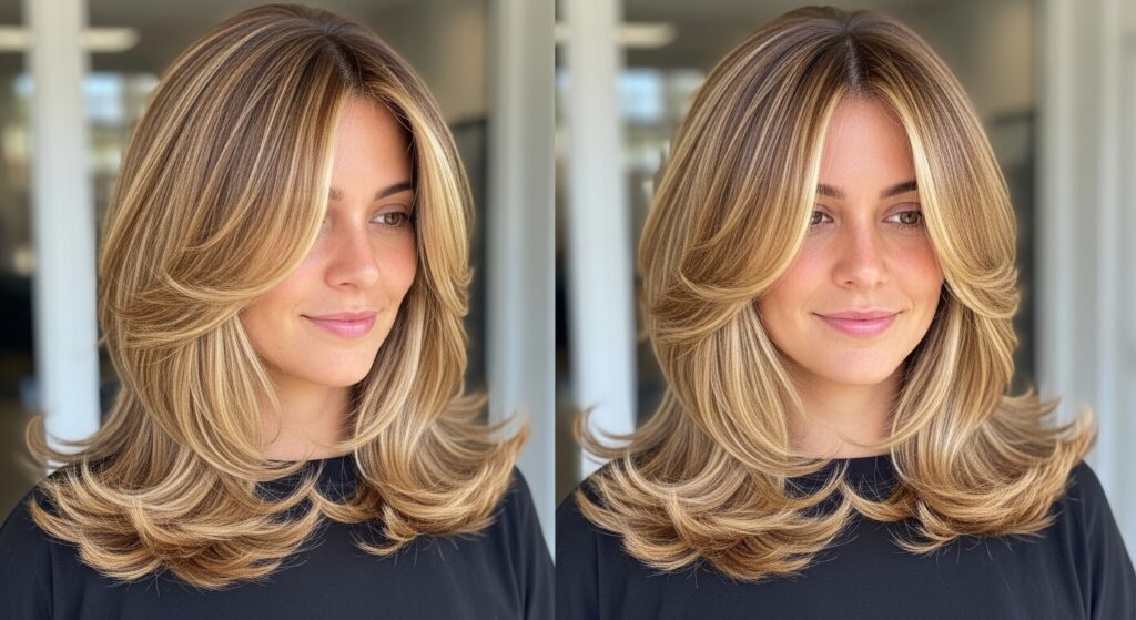 Ask your stylist for long, cascading layers that start at the chin or jawline. These layers will curl or fall inward, framing your cheeks and jaw, which creates a visual “border” around your face and reduces the focus on the upper portion. It’s a soft, low-commitment strategy.