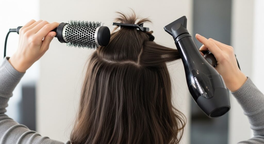 Flat hair on top can emphasize the length of the forehead. Use a volumizing spray at the roots and a round brush while blow-drying to lift the hair at the crown. This added height creates a more proportional relationship between the top and bottom of your face.