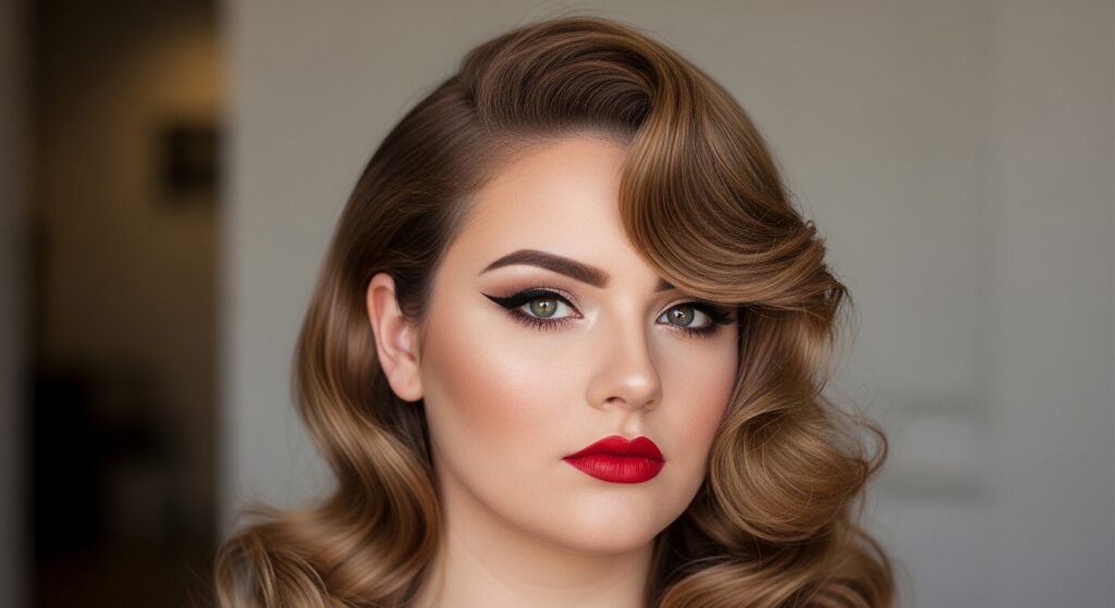 For a glamorous look, try deep, voluminous waves brushed out into a classic Hollywood style. The height at the crown is crucial, and the structured wave pattern creates strong, vertical lines. A deep side part complements this style perfectly.