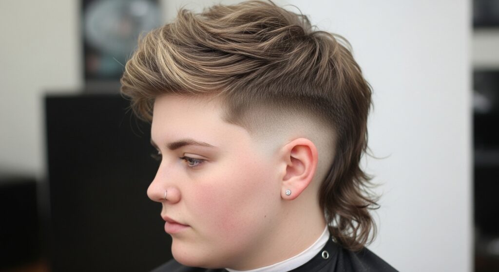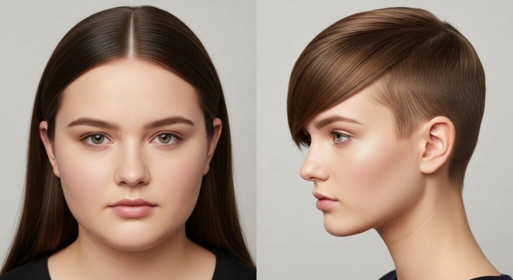 For the fashion-forward, a softened, modern mullet (short at the front and sides, longer in the back) creates interesting angles and a directional shape that defies roundness. It’s edgy, fun, and naturally draws the eye back and down.