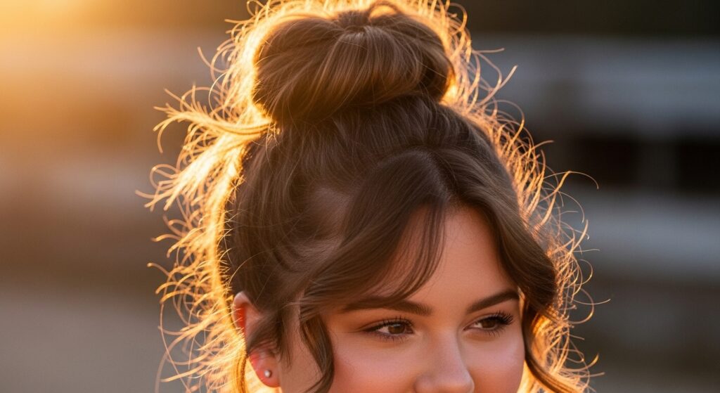 Position your bun or top knot high on the crown, not at the nape of your neck. Keep it loose and messy, and deliberately leave out strategic pieces around your face to soften and frame it. The height is what gives the elongating effect.