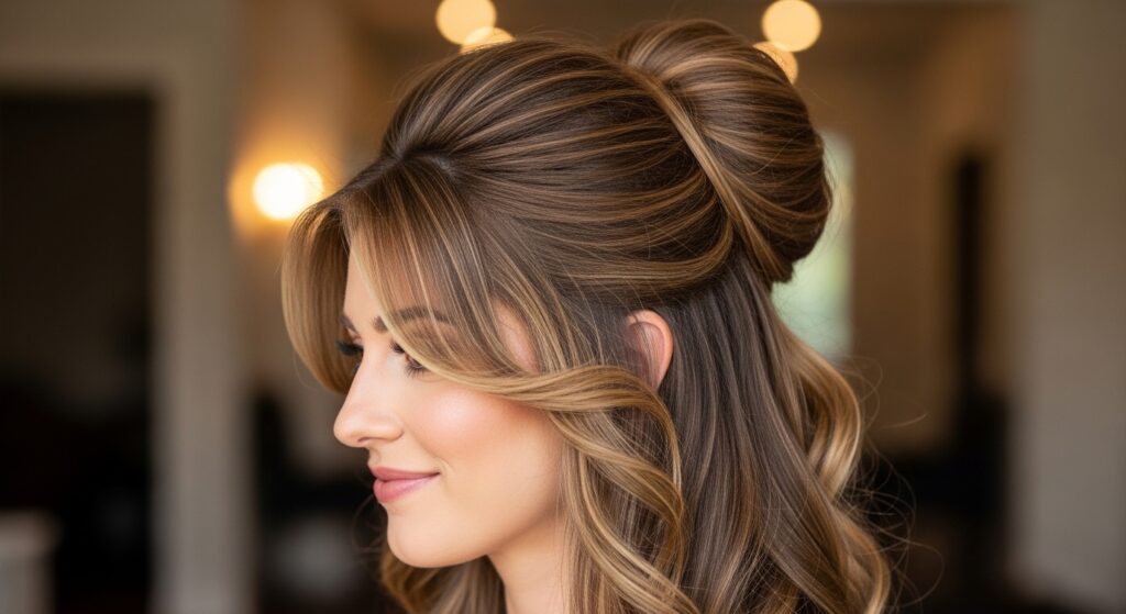 A half-up style isn’t just for casual days. By teasing or backcombing the crown section lightly before pulling the top half back, you create significant volume at the top of the head. This lifted hair can then fall forward slightly, providing coverage for scars on the crown or upper scalp.