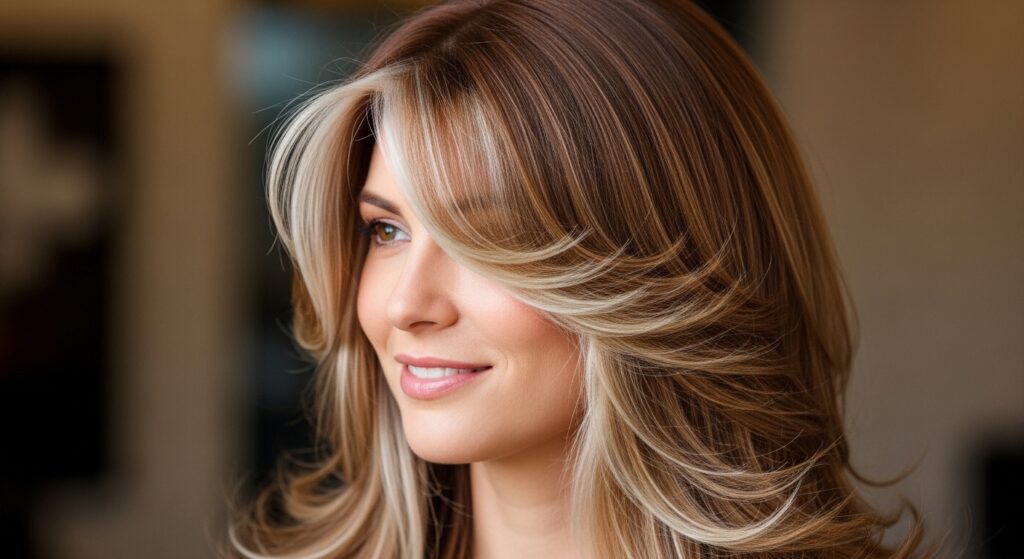 Strategic coloring can work in tandem with cutting. Adding lighter face-framing highlights or a money piece around the front draws the eye to the colored sections, which are cut to fall in specific areas. The combination of light and layers creates a beautiful distraction and effective coverage.