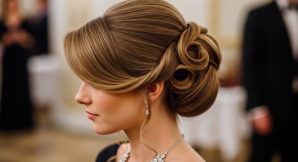 For formal events, an updo with a soft, side-swept front offers full coverage with sophistication. Instead of pulling all hair back tightly, the front section is curled and swept to one side, often pinned just above the ear, creating a cascade of hair that covers one entire side of the hairline and temple.