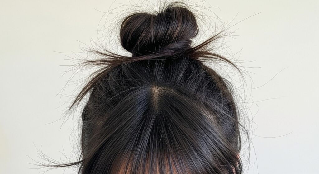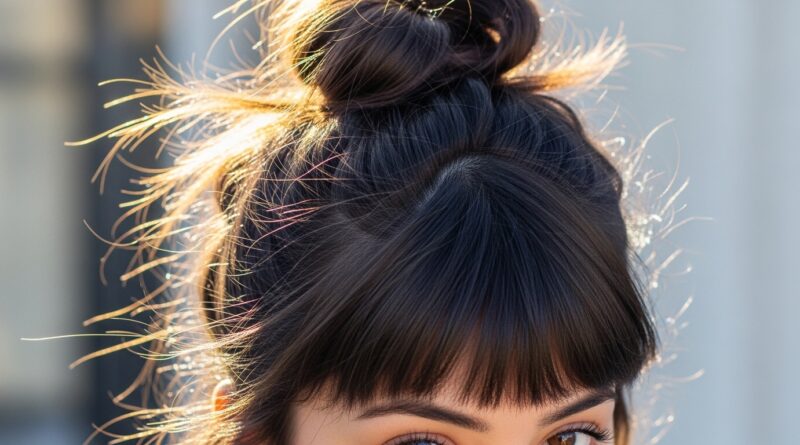 The messy top knot is a lifesaver. By pulling hair into a high, loose knot, you can allow wispy bangs and shorter pieces to fall out naturally. These pieces can be arranged to cover the forehead and temples, while the knot itself adds height and draws the eye upward.