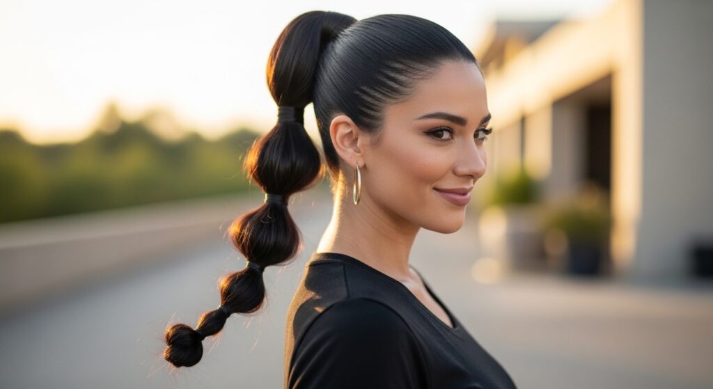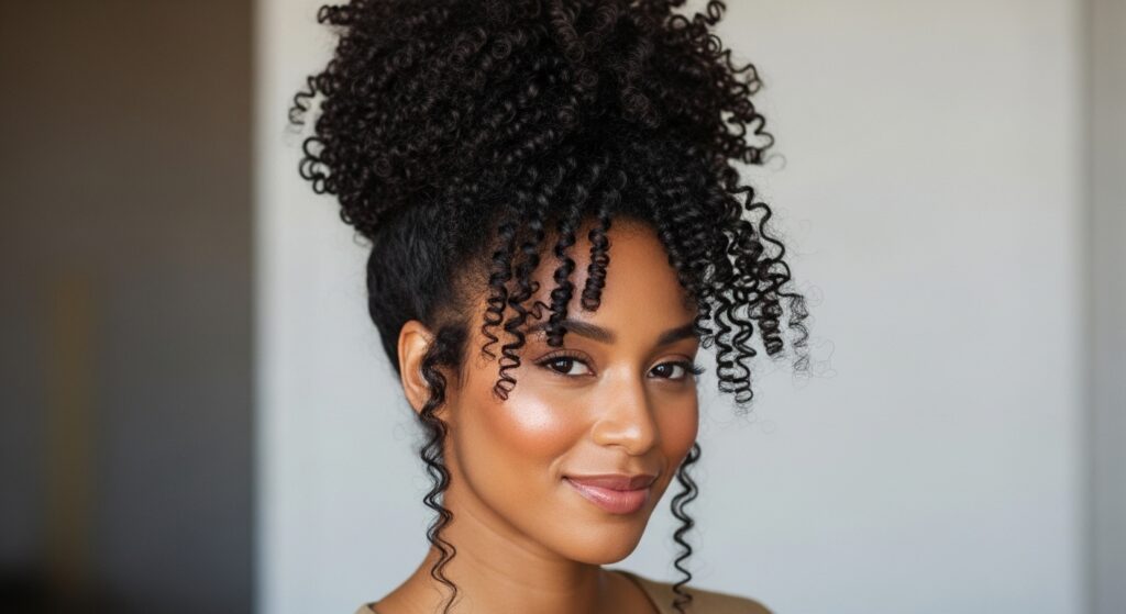 A fantastic style for natural hair that celebrates volume and texture. Gather a generous section of hair from the very top of your head. Tease it slightly at the roots for lift, then secure it into a high ponytail. Wrap the ponytail into a voluminous bun that sits proudly on the crown. This look is bold, beautiful, and incredibly effective at keeping hair off your face and neck.
