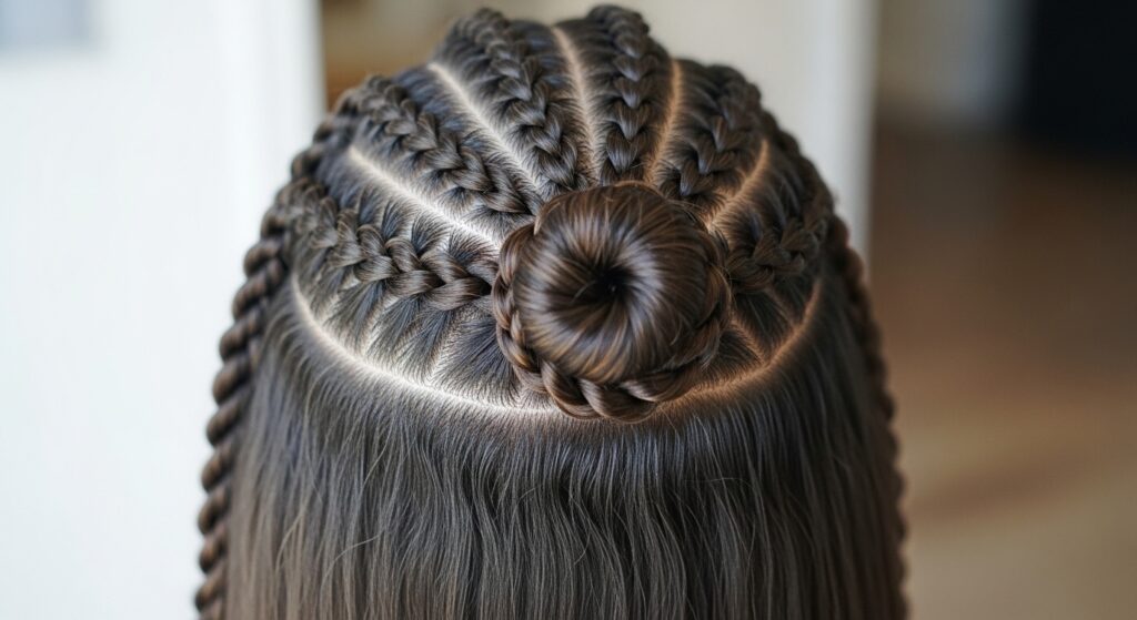 Add a romantic, boho touch to your look. Create two braids (Dutch or French braids work beautifully) starting at your temples, going back along your hairline. Secure them at the back of your crown with a clear elastic, then twist the gathered hair and any remaining hair from the braids into a small, centered bun. This style keeps every strand securely in place with major fairy-tale flair.