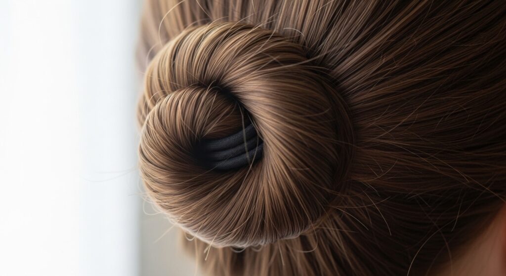 For an elegant, ballet-inspired look, try this. Gather the top and side sections of your hair as if for a low ponytail at the back of your head, but leave out the bottom layers. Use a hair donut (or sock bun) to create a perfect, round bun at the nape of your neck with the gathered hair. This style is exceptionally graceful and keeps hair off your face and the top of your neck.