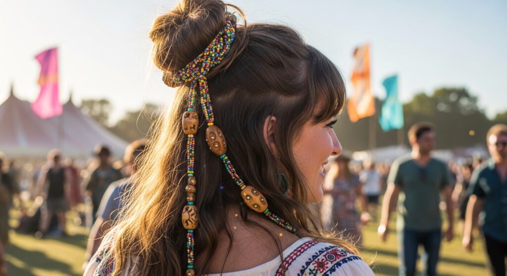 Take your bun to festival-level boho. After creating your bun, take a long, beaded hair chain or a leather cord and wrap it around the bun several times, letting the ends dangle. You can also weave it through the bun. It’s a stunning, eye-catching detail that makes the hairstyle the main event.