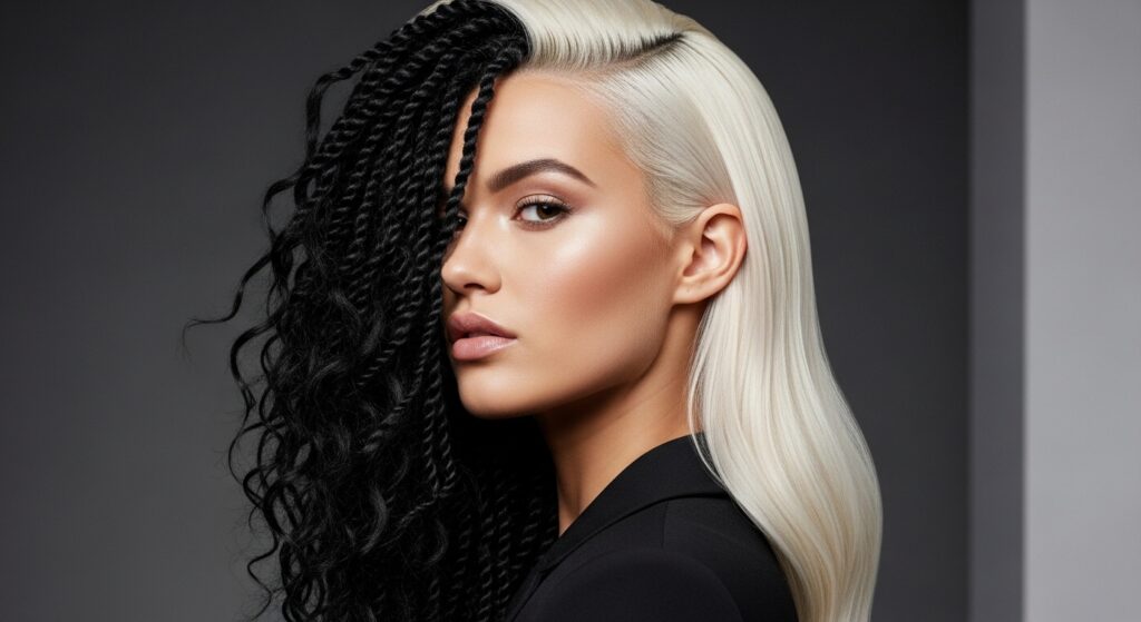 Go beyond ombré with a bold color-blocking technique. Install twists in two distinct, contrasting colors—like black and blonde, or blue and purple—in clear sections (e.g., left side vs. right side, or front vs. back). This is a guaranteed head-turner.