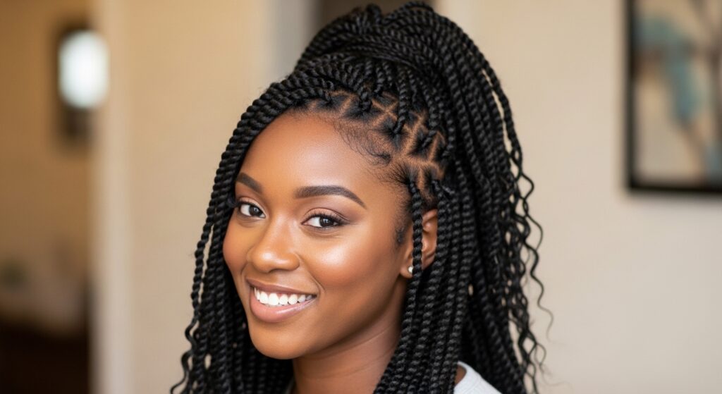 Channel your inner warrior. Gather the twists from the center of your head into a high, vertical ponytail or series of pinned-up twists, leaving the sides sleek or down. This architectural style is powerful, fashion-forward, and radiates confidence.
