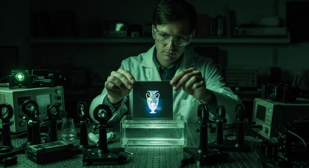 The original hologram technique. A laser beam is split into two: one illuminates the object, the other acts as a reference beam. The interference pattern between the two is recorded on a high-resolution plate. When illuminated again, it reconstructs the light field of the object, creating a true 3D image with parallax and depth. This is the gold standard for static holograms.