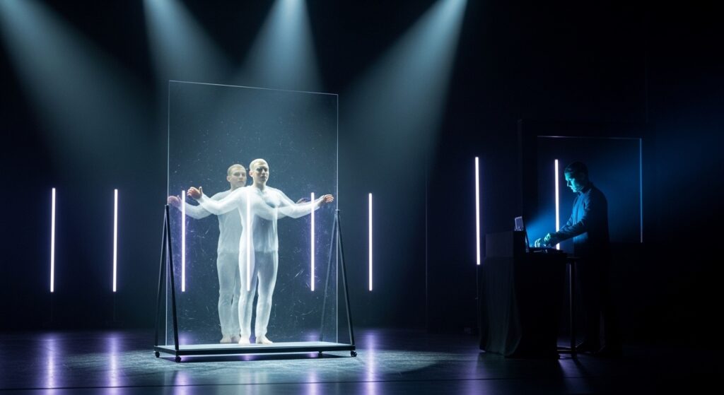 One of the oldest tricks in the book, Pepper’s Ghost uses a simple sheet of glass or plexiglass angled between the audience and a hidden scene or object. By controlling the lighting, the hidden image is reflected into the viewer’s line of sight, creating a ghostly, translucent apparition that seems to occupy real space. This technique is a staple in theater, haunted houses, and has even been used for “holographic” concert performances.